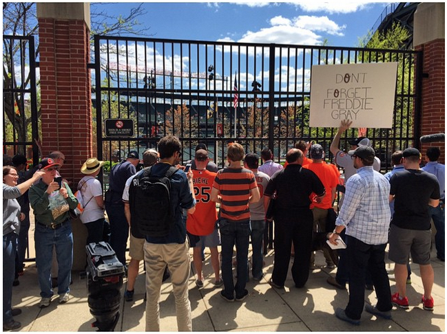 On Wednesday April 29, 2015, the Baltimore Orioles played the Chicago White Sox, and for the first time in the MLB’s history the game was played before a locked out stadium. Commentary was plentiful during and after the game, with many using the spectacle to make a larger statement of how to frame the unrest in Baltimore. Many, like CNN, commented on the eeriness of the game and its unprecedented nature. “As protests and occasional violent unrest rocked Baltimore after the death of Freddie Gray while in police custody,” one report explained, “the Orioles took an unprecedented step in American sports history by barring fans for the final game of their series against the White Sox.”