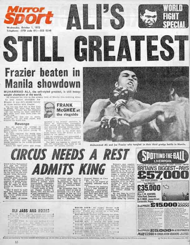 When we crest into the 2020s, the significant mega-matches that comprised this era will each celebrate their semicentennials. Doubtless the print, video, and digital venerations will disseminate accordingly. Richard Hoffer’s Bouts of Mania already set the tempo for Golden Jubilees about prize fighting’s “last golden age.” His fast-paced prose and first-hand accounts recreate the exhilaration triggered by a coterie of great fighters and their saga of brutal bouts. But the Era of Fantastic Millions’ coup de grâce, Muhammad Ali vs. Joe Frazier at the Araneta Coliseum in Quezon City, occurred forty years ago today. In the sobriety of a Ruby Anniversary there is opportunity to review the multiple legacies bestowed by the finale of Ali and Frazier’s trilogy, and the last blow of a short, hot Chinook for heavyweight boxing.