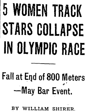 The fact that Germany’s Radke won the race in world record breaking time, as did the other five top finishers, did not play a role in the media’s diagnosis of the problem. These performances, which outmatched all previous records, couldn’t, at least for the media, explain the understandable exhaustion after running the half mile. According to the press, the only viable reason for world-record breaking women to exhibit visible exhaustion was innate female frailty. Surely it couldn’t have been the fact that they had run faster than any before them. All these competitors had shown, at least in the eyes of the (male-dominated) media was that they were too weak to complete two laps around the track.