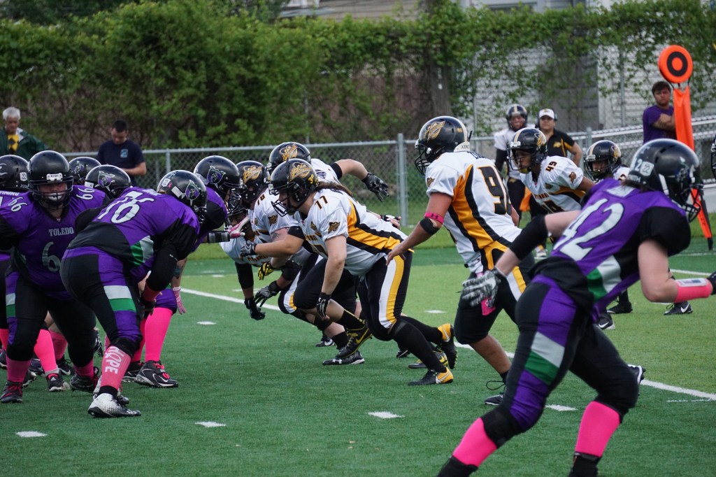 The Dark Angels are the descendents of the Detroit Demolition, who won five National Women’s Football League, and one Independent Women’s Football League championships from 2002-2007. Their season record is deceptive, since they lost two games to the Renegades, and the other loss was to the championship bound Dynamite. Clarissa Tullis anchored their ground game with 525 yards, and with her three backfield mates, they gained over 1,000 yards rushing. Jacquie Bennington, a former player and now part of the ownership group, told me that she has “watched this group of women work hard, especially with the amount of rookies we have this season, to get to where we are. I’m proud of all their hard work and dedication to back in this big game.”